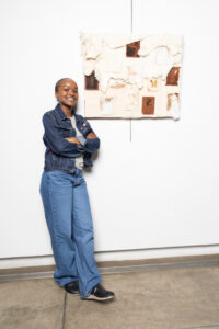 • Snelihle Asanda Maphumulo (22) – Ngaphansi kwesithunzi sakhe (Under His Shadow) (Sheep hide on canvas)